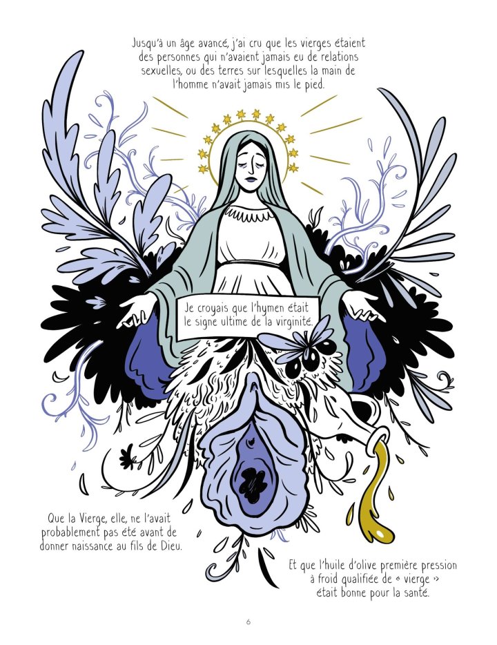 Contes médiévaux, transidentité, violences sexuelles, l’album Vierges brasse un large spectre de thématiques, s’attaquant à ce concept dans les plus petits détails de sa construction. Journaliste de profession, Elise Thiébaut inscrit ses recherches dans une pluralité de domaines : histoire des sciences, histoire littéraire, linguistique, nous offrant ainsi une étude complète et bien référencée.